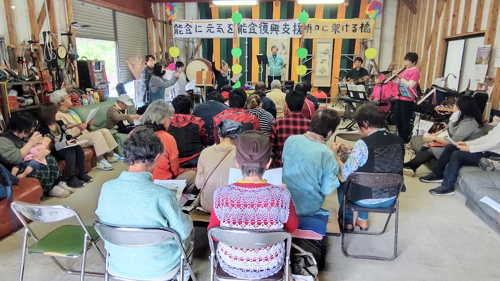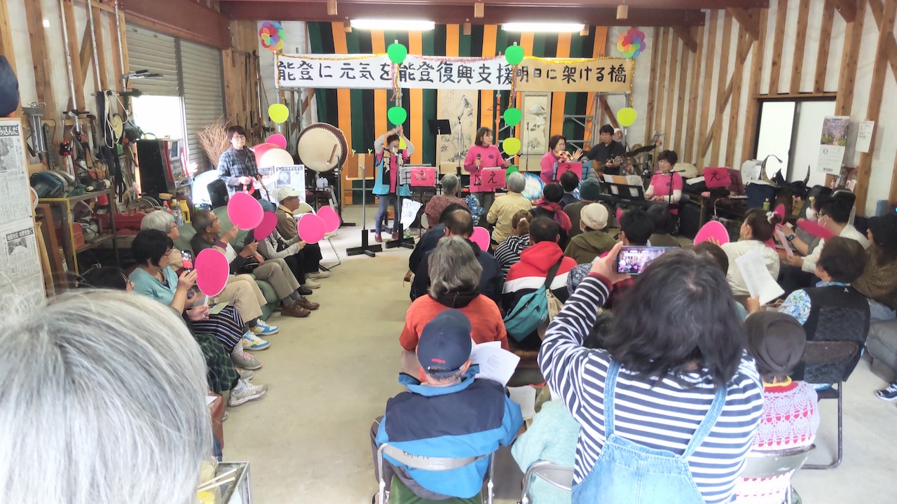 NPOスマイル安房主催の「能登復興支援・みんなで歌おう!うたごえ広場」は 今日(4月7日)13時から、薄日がさす暖かい天候のなか 70人近い方に来場いただき、かなりいい感じに盛り上がりました! 2時間経っても席を立つ人はわずかで アンコールを2曲歌って、大盛況のうちに散会しました。 みなさまからの支援金は、さっそく珠洲市にお届けするとのことです。 電波が届かない山の中までお越しいただき、ありがとうございました。
